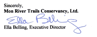 With this letter, the Mon River Trails Conservancy (MRTC) is lending its support to the Interim Solution for recreational boating on the Upper Monongahela River proposed by the Upper Monongahela River Association. As proposed, MRTC would like to see this solution in effect until such time as our three locks are restored to 24/7 operations, either through implementation of your initiative for remote operation of our three locks from the Point Marion lock, or, by funding sufficient to staff our locks with lock operators.