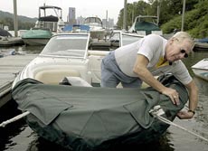 Pam Panchak, Post-Gazette - J.D. Fogarty works on covering his boat at Washington's Landing Marina after a report of bad weather forced him to cancel a boating trip.