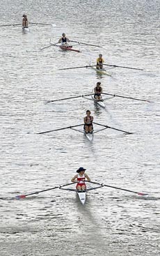 Robin Rombach, Post-Gazette - Rowers participating in the 2004 Head of the Ohio race make their way back to the boat ramps after their competition. The rowing race, held each October, attracts 5,000 participants,
