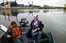 Mike Iaconelli, the 2003 Bassmaster Classic champ, right, used a map and a GPS device to mark a promising fishing spot last fall as Dennis F. Tubbs, Aquatic Resource Program Specialist for the Pennsylvania Fish & Boat Commission toured him through the three rivers surrounding Point State Park, Downtown.