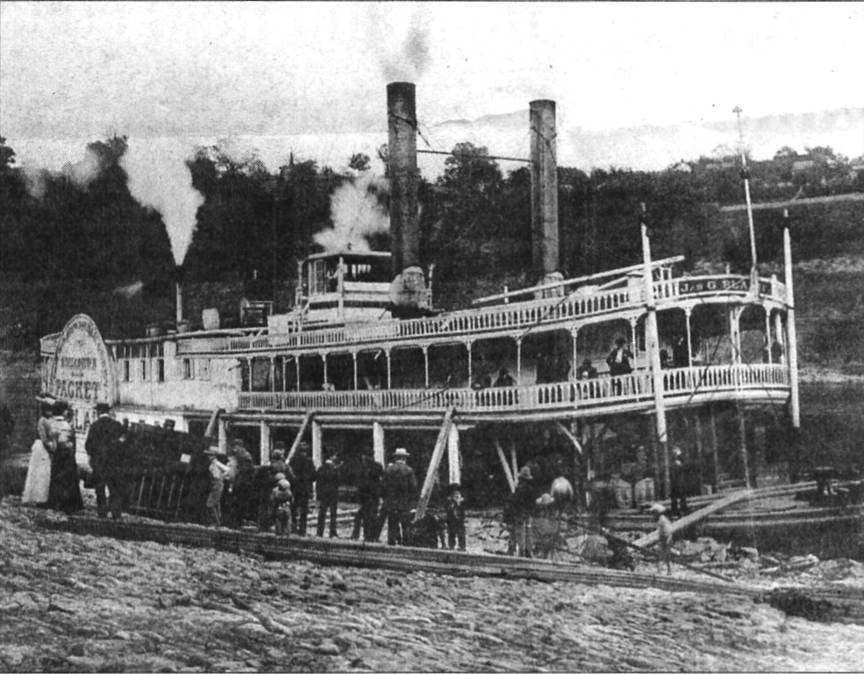 "The Arlington Band discoursed charming music along the river and the high hills echoed back the sweet strains. As the coming of the steamer and the strains of music drew the overjoyed people to the shores, many anxious to make the first trip to Morgantown, and scene after scene of beauty came into sight, the crowd got jolly and the fermentation of Pennsylvania and West Virginia 'mountain dew' caused the boys to get elated and the crowd became one surging mass.