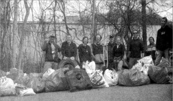 After cleaning up the area of Deckers Creek in Sabraton Wednesday, members from both Friends of Deckers Creek and the West Virginia University's Recreation, Parks, and Tourism Resources class stand behind the day's collected garbage. The group had more than two dozen bags of trash along with some unusual items, including a crutch and a wine glass.