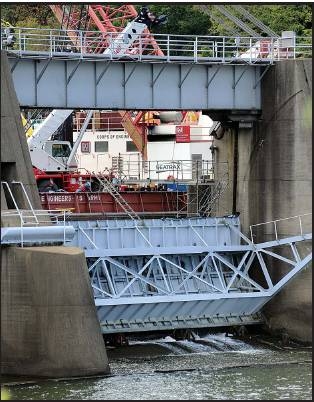 U.S. Army Corps of Engineers workers to get onto the metal gates to