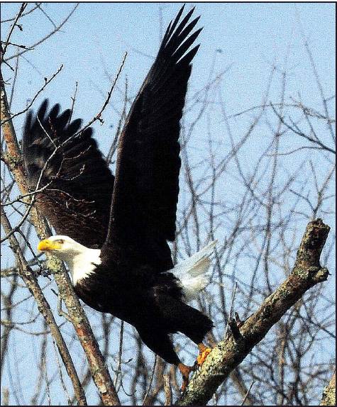 A bald eagle (above) prepares to launch from a