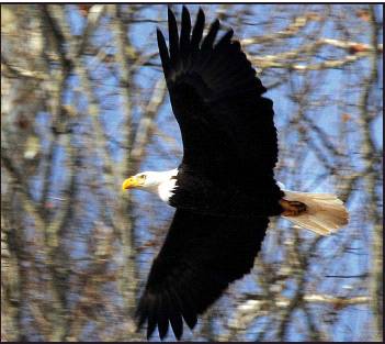 Dam on Wednesday. The bald eagle (below) glides through the air toward