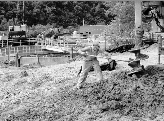 Bob Gay/The Dominion Post - Tony Shuman, of Bilco Construction, cleans soil from a drill while working on the new secondary clarifier at the MUB treatment plant in Star City.