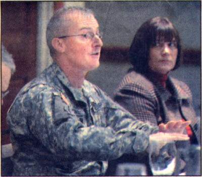Col. Michael Crall (left) and Mary Ann Bucci attend the meeting at Waterfront Place Hotel to discuss new navigation traffic patterns on the Monongahela River. - Ron Rittenhouse - The Dominion Post